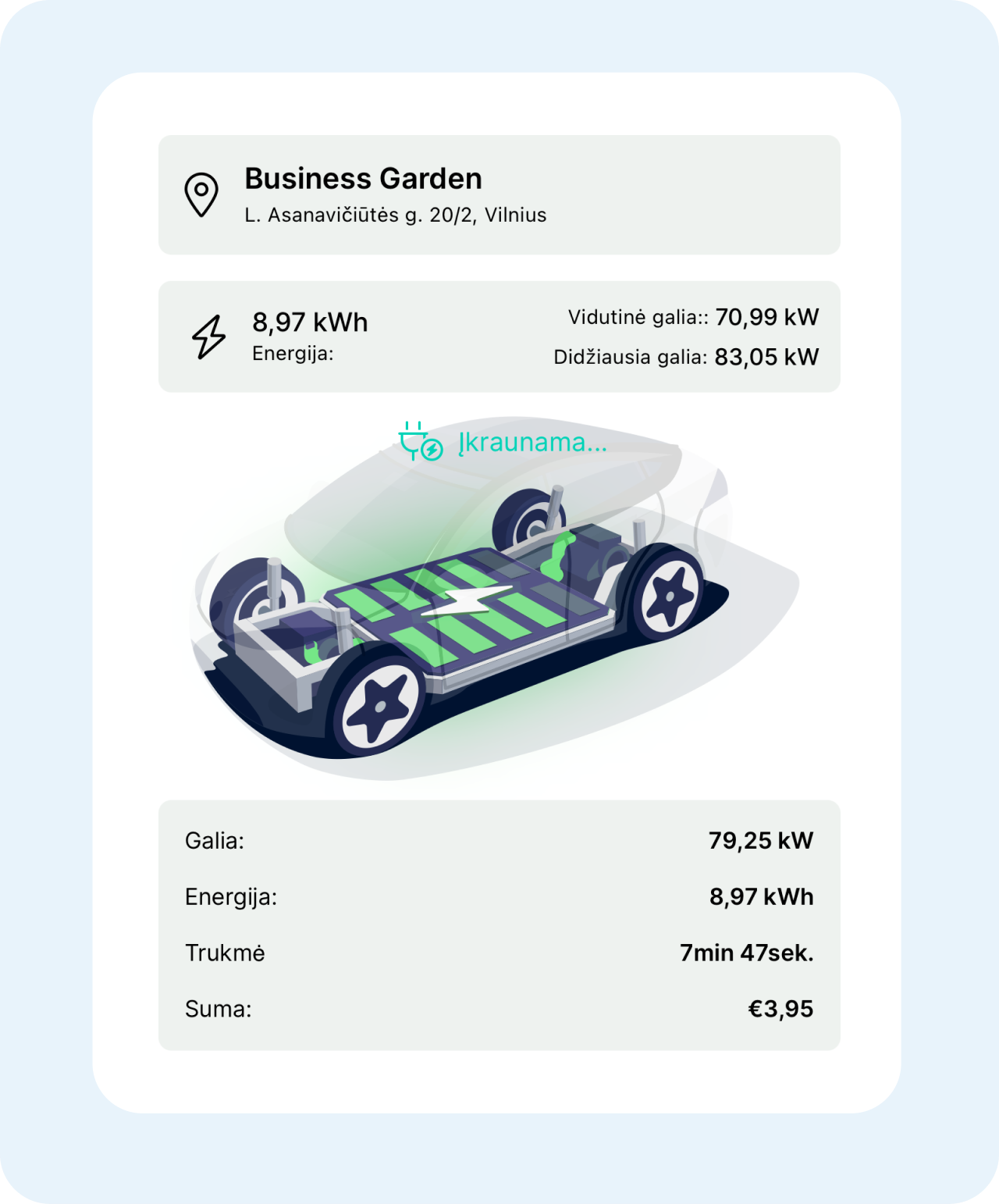 Atsiskaitant už įkrovimą taikomas jūsų programėlėje pasirinktas būdas – mokėjimo kortelė, o jei esate verslo klientas – įmonės kredito limitas.